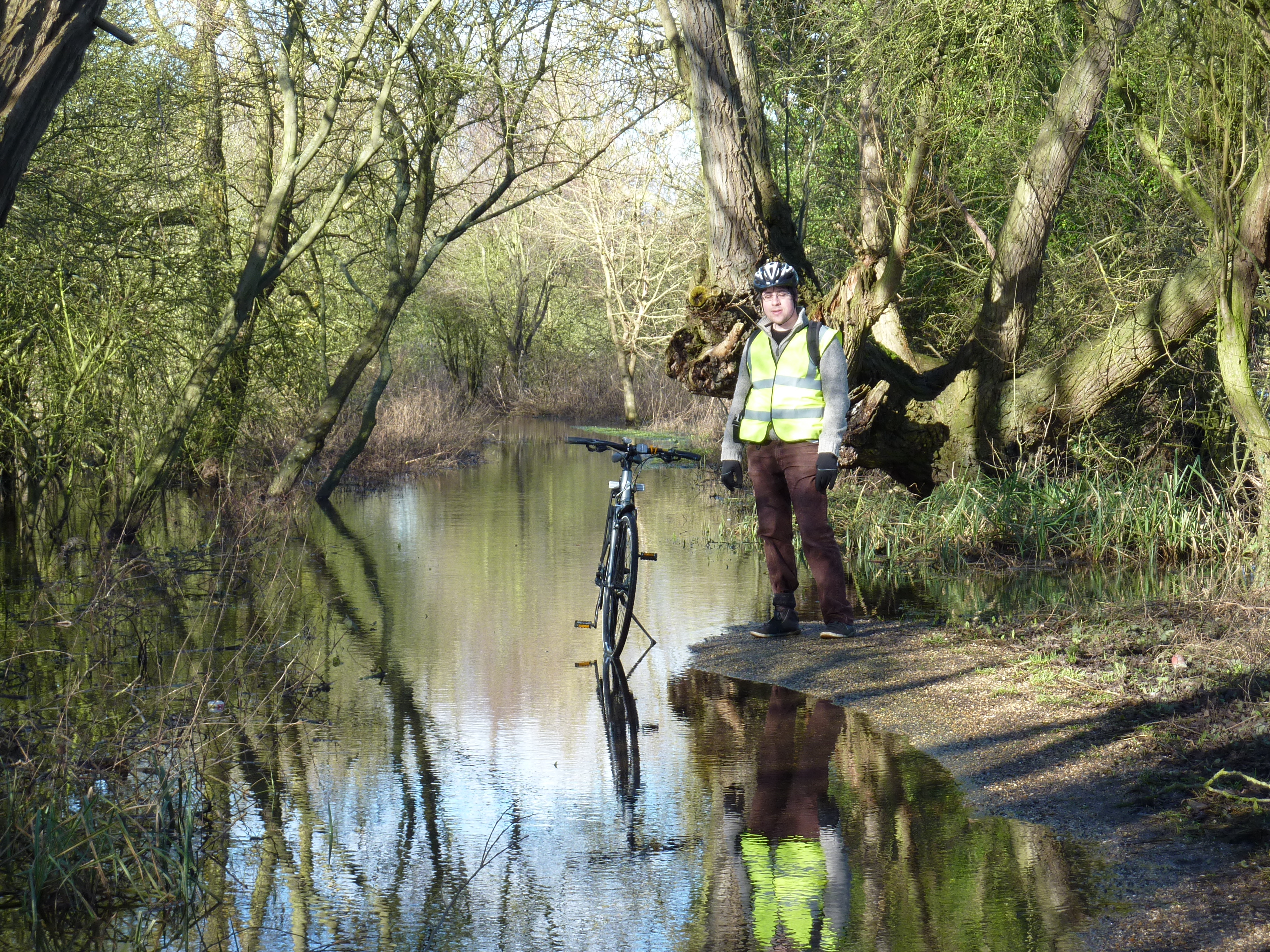 From here to Abingdon the route was mostly on the road.  A welcome change from bumpy gravel tracks and cattle grids.  Just outside of Abingdon (back on another traffic free part of the Cycle Network) we encountered another flooded path.  This looked deeper than the other section and as the path curved away from us it appeared to go on forever.  Some cyclists ahead of us decided not to brave the water and at this point we were very tempted to turn back.  Just as we were dithering a couple of runners came along and refusing to be defeated by a bit of water (“let’s just put our shoes in the wash when we get back”) ran on through.  They helpfully called back to us that it didn’t in fact go on forever and was dry up ahead.  We continued on.  Feet now even wetter than before.